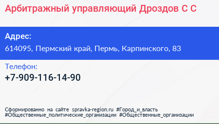 Арбитражный управляющий Дроздов С.С. по адресу 614095, Пермский край, Пермь, Карпинского, 83 в дальнейшем Организация, размещена в следующих категориях: