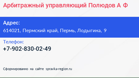 Арбитражный управляющий Полюдов А.Ф. по адресу 614021, Пермский край, Пермь, Лодыгина, 9 в дальнейшем Организация, размещена в следующих категориях: