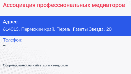 Ассоциация профессиональных медиаторов по адресу 614015, Пермский край, Пермь, Газеты Звезда, 20 в дальнейшем Организация, размещена в следующих категориях: