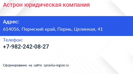 Астрон, юридическая компания по адресу 614056, Пермский край, Пермь, Целинная, 41 в дальнейшем Организация, размещена в следующих категориях: