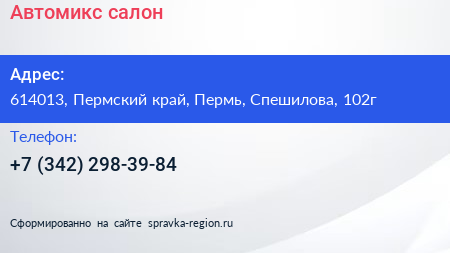 Автомикс, салон по адресу 614013, Пермский край, Пермь, Спешилова, 102г в дальнейшем Организация, размещена в следующих категориях: