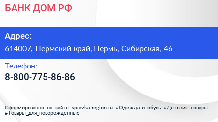 БАНК ДОМ.РФ по адресу 614007, Пермский край, Пермь, Сибирская, 46 в дальнейшем Организация, размещена в следующих категориях:
