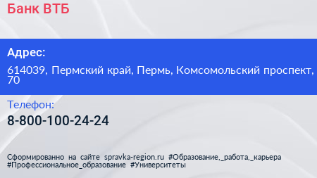 Банк ВТБ по адресу 614039, Пермский край, Пермь, Комсомольский проспект, 70 в дальнейшем Организация, размещена в следующих категориях: