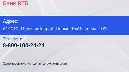 Банк ВТБ по адресу 614010, Пермский край, Пермь, Куйбышева, 103 в дальнейшем Организация, размещена в следующих категориях: