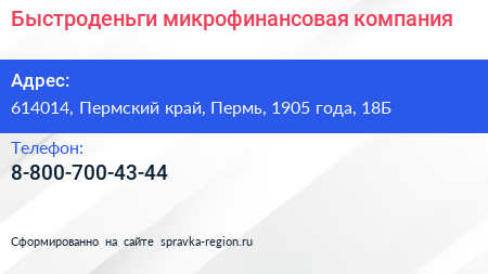 Быстроденьги, микрофинансовая компания по адресу 614014, Пермский край, Пермь, 1905 года, 18Б в дальнейшем Организация, размещена в следующих категориях: