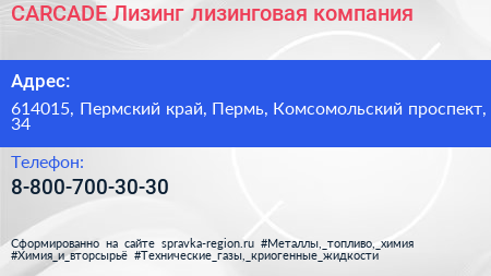 CARCADE Лизинг, лизинговая компания по адресу 614015, Пермский край, Пермь, Комсомольский проспект, 34 в дальнейшем Организация, размещена в следующих категориях: