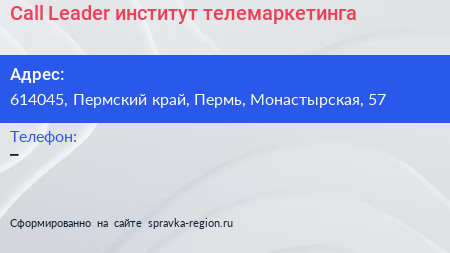 Call Leader, институт телемаркетинга по адресу 614045, Пермский край, Пермь, Монастырская, 57 в дальнейшем Организация, размещена в следующих категориях: