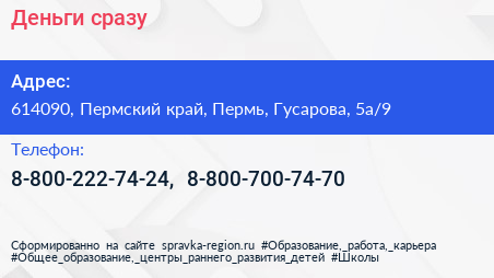 Деньги сразу по адресу 614090, Пермский край, Пермь, Гусарова, 5а/9 в дальнейшем Организация, размещена в следующих категориях: