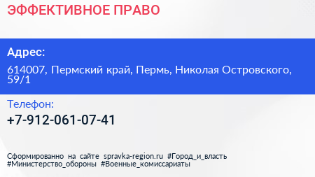 ЭФФЕКТИВНОЕ ПРАВО по адресу 614007, Пермский край, Пермь, Николая Островского, 59/1 в дальнейшем Организация, размещена в следующих категориях: