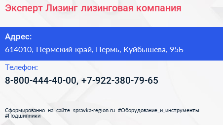 Эксперт-Лизинг, лизинговая компания по адресу 614010, Пермский край, Пермь, Куйбышева, 95Б в дальнейшем Организация, размещена в следующих категориях:
