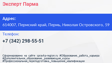 Эксперт-Парма по адресу 614007, Пермский край, Пермь, Николая Островского, 59 в дальнейшем Организация, размещена в следующих категориях: