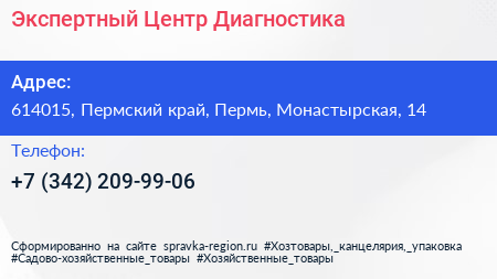 Экспертный Центр Диагностика по адресу 614015, Пермский край, Пермь, Монастырская, 14 в дальнейшем Организация, размещена в следующих категориях: