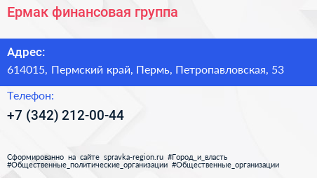 Ермак, финансовая группа по адресу 614015, Пермский край, Пермь, Петропавловская, 53 в дальнейшем Организация, размещена в следующих категориях: