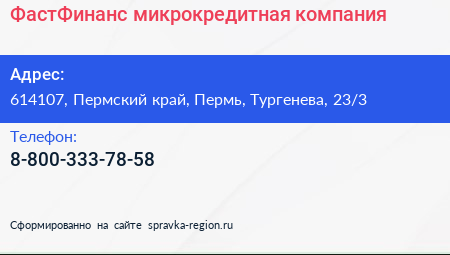 ФастФинанс, микрокредитная компания по адресу 614107, Пермский край, Пермь, Тургенева, 23/3 в дальнейшем Организация, размещена в следующих категориях: