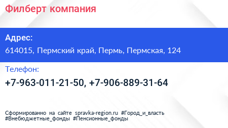 Филберт, компания по адресу 614015, Пермский край, Пермь, Пермская, 124 в дальнейшем Организация, размещена в следующих категориях: