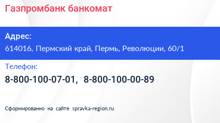 Газпромбанк, банкомат по адресу 614016, Пермский край, Пермь, Революции, 60/1 в дальнейшем Организация, размещена в следующих категориях: