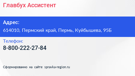 Главбух Ассистент по адресу 614010, Пермский край, Пермь, Куйбышева, 95Б в дальнейшем Организация, размещена в следующих категориях:
