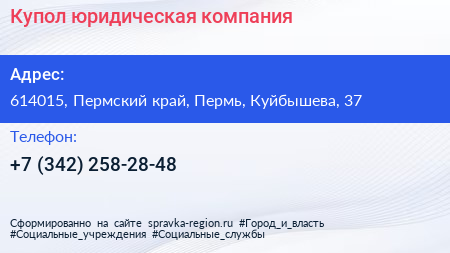 Купол, юридическая компания по адресу 614015, Пермский край, Пермь, Куйбышева, 37 в дальнейшем Организация, размещена в следующих категориях: