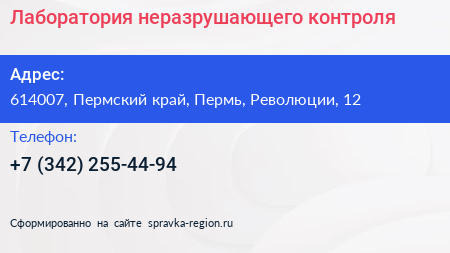 Лаборатория неразрушающего контроля по адресу 614007, Пермский край, Пермь, Революции, 12 в дальнейшем Организация, размещена в следующих категориях: