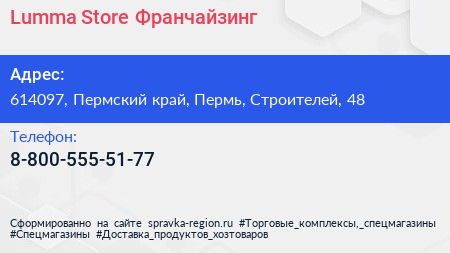 Lumma Store Франчайзинг по адресу 614097, Пермский край, Пермь, Строителей, 48 в дальнейшем Организация, размещена в следующих категориях: