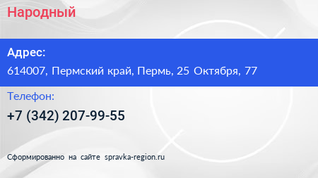 Народный по адресу 614007, Пермский край, Пермь, 25 Октября, 77 в дальнейшем Организация, размещена в следующих категориях: