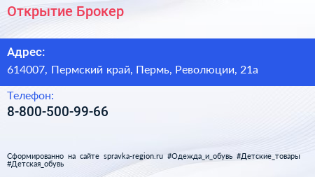 Открытие Брокер по адресу 614007, Пермский край, Пермь, Революции, 21а в дальнейшем Организация, размещена в следующих категориях: