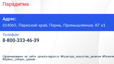 Парадигма по адресу 614065, Пермский край, Пермь, Промышленная, 87 к1 в дальнейшем Организация, размещена в следующих категориях: