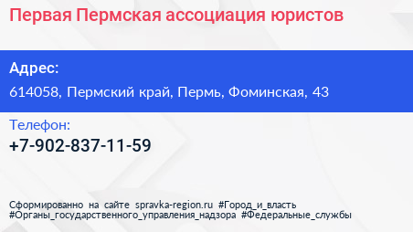 Первая Пермская ассоциация юристов по адресу 614058, Пермский край, Пермь, Фоминская, 43 в дальнейшем Организация, размещена в следующих категориях: