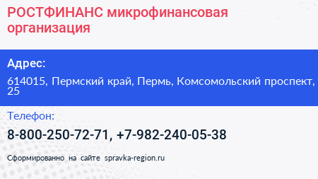 РОСТФИНАНС, микрофинансовая организация по адресу 614015, Пермский край, Пермь, Комсомольский проспект, 25 в дальнейшем Организация, размещена в следующих категориях: