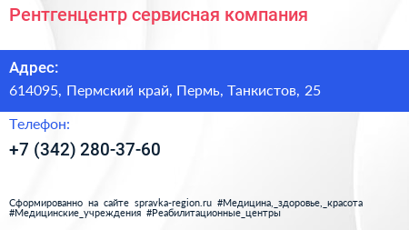 Рентгенцентр, сервисная компания по адресу 614095, Пермский край, Пермь, Танкистов, 25 в дальнейшем Организация, размещена в следующих категориях: