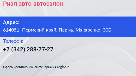 Риал-авто, автосалон по адресу 614051, Пермский край, Пермь, Макаренко, 30Б в дальнейшем Организация, размещена в следующих категориях: