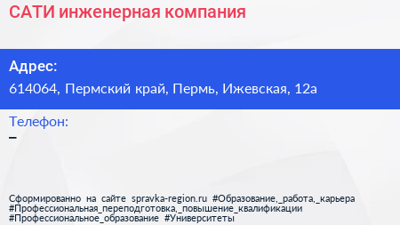САТИ, инженерная компания по адресу 614064, Пермский край, Пермь, Ижевская, 12а в дальнейшем Организация, размещена в следующих категориях: