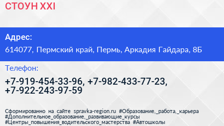 СТОУН-XXI по адресу 614077, Пермский край, Пермь, Аркадия Гайдара, 8Б в дальнейшем Организация, размещена в следующих категориях: