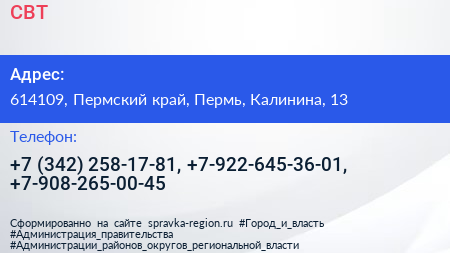 СВТ по адресу 614109, Пермский край, Пермь, Калинина, 13 в дальнейшем Организация, размещена в следующих категориях: