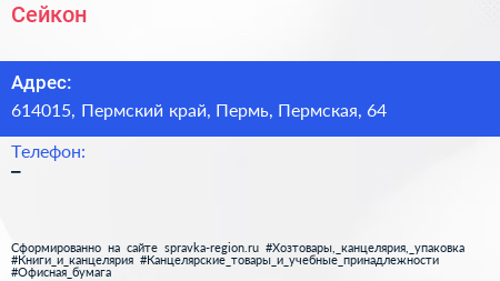 Сейкон по адресу 614015, Пермский край, Пермь, Пермская, 64 в дальнейшем Организация, размещена в следующих категориях:
