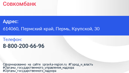 Совкомбанк по адресу 614060, Пермский край, Пермь, Крупской, 30 в дальнейшем Организация, размещена в следующих категориях: