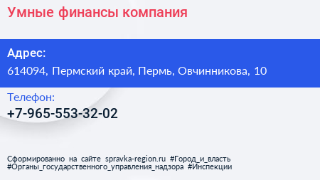 Умные финансы, компания по адресу 614094, Пермский край, Пермь, Овчинникова, 10 в дальнейшем Организация, размещена в следующих категориях: