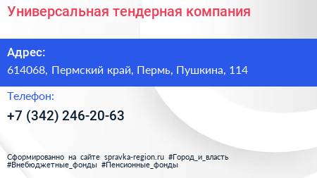 Универсальная тендерная компания по адресу 614068, Пермский край, Пермь, Пушкина, 114 в дальнейшем Организация, размещена в следующих категориях: