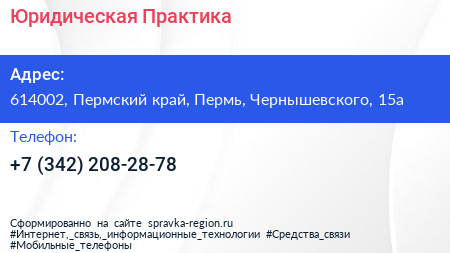Юридическая Практика по адресу 614002, Пермский край, Пермь, Чернышевского, 15а в дальнейшем Организация, размещена в следующих категориях: