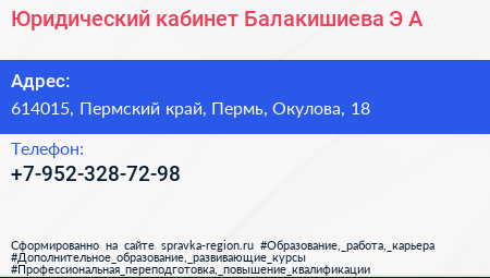 Юридический кабинет Балакишиева Э.А. по адресу 614015, Пермский край, Пермь, Окулова, 18 в дальнейшем Организация, размещена в следующих категориях: