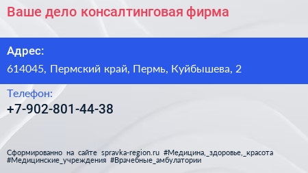Ваше дело, консалтинговая фирма по адресу 614045, Пермский край, Пермь, Куйбышева, 2 в дальнейшем Организация, размещена в следующих категориях: