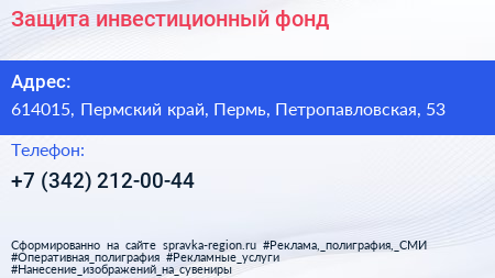 Защита, инвестиционный фонд по адресу 614015, Пермский край, Пермь, Петропавловская, 53 в дальнейшем Организация, размещена в следующих категориях: