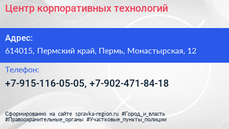 Центр корпоративных технологий по адресу 614015, Пермский край, Пермь, Монастырская, 12 в дальнейшем Организация, размещена в следующих категориях: