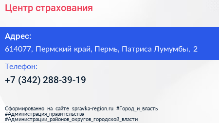 Центр страхования по адресу 614077, Пермский край, Пермь, Патриса Лумумбы, 2 в дальнейшем Организация, размещена в следующих категориях: