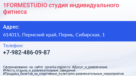 1FORMESTUDIO, студия индивидуального фитнеса по адресу 614015, Пермский край, Пермь, Сибирская, 1 в дальнейшем Организация, размещена в следующих категориях:
