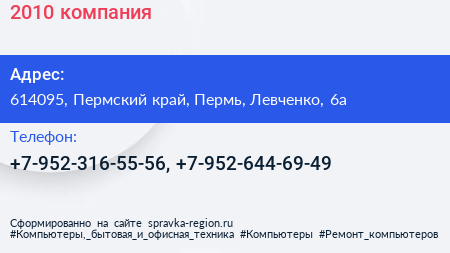 2010, компания по адресу 614095, Пермский край, Пермь, Левченко, 6а в дальнейшем Организация, размещена в следующих категориях: