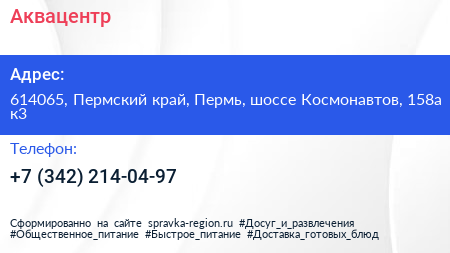 Аквацентр по адресу 614065, Пермский край, Пермь, шоссе Космонавтов, 158а к3 в дальнейшем Организация, размещена в следующих категориях: