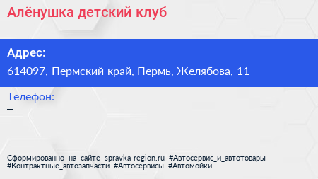 Алёнушка, детский клуб по адресу 614097, Пермский край, Пермь, Желябова, 11 в дальнейшем Организация, размещена в следующих категориях: