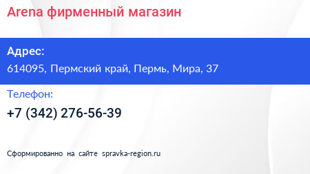 Arena, фирменный магазин по адресу 614095, Пермский край, Пермь, Мира, 37 в дальнейшем Организация, размещена в следующих категориях:
