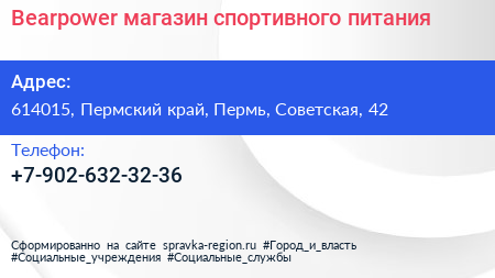Bearpower, магазин спортивного питания по адресу 614015, Пермский край, Пермь, Советская, 42 в дальнейшем Организация, размещена в следующих категориях: